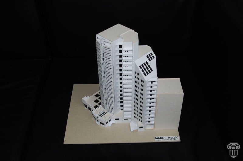Этот макет я сделал еще в 2003 году, когда был студентом пятого курса. Макет был подготовлен к одной из курсовых работ на тему "Многоэтажный жилой дом со встроенно-пристроенными помещениями общественного назначения".